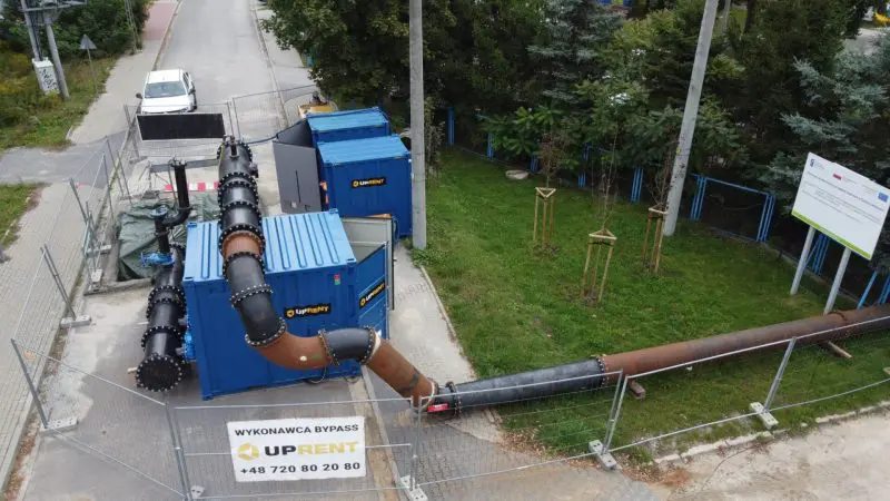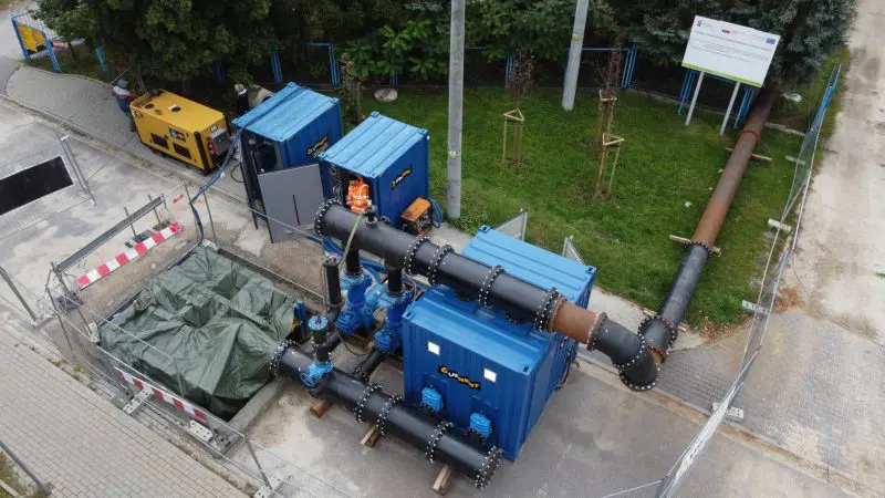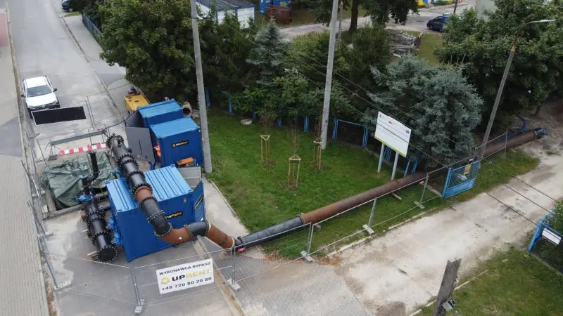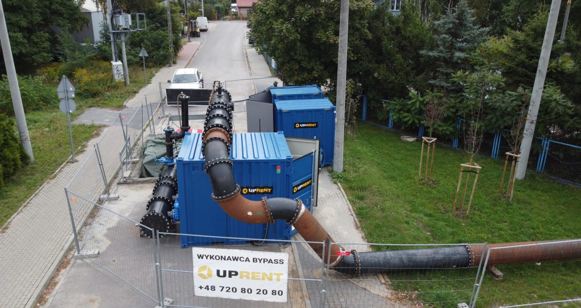 W ramach wygranego przetargu do tymczasowego pompowania ścieków wykorzystano 1 kontener z dwoma pompami Hidrostal F10HD z oddzielnym systemem próżniowym oraz 2 pompy burzowe Hidrostal F10HD o łącznej wydajności 4000 m3/h z rezerwowym systemem próżniowym zasilającym pompę Busch. Pompy były sterowane automatycznie za pomocą sterownika PLC, co pozwoliło na bezobsługową pracę sprzętu przez cały czas trwania projektu. Pompy burzowe były zasilane z oddzielnego źródła zasilania dostarczonego przez Renta Pumps. Był to agregat prądotwórczy o mocy 110 kVA od producenta CAT z automatyką umożliwiającą uruchomienie generatora, gdy poziom ścieków w komorze ssącej gwałtownie wzrósł. Ścieki były transportowane do oczyszczalni stalowym rurociągiem o średnicy 500 mm i długości 25 mb z bezpośrednim połączeniem z dwoma niezależnymi kanałami o średnicy 600 mm i długości 2700 mb