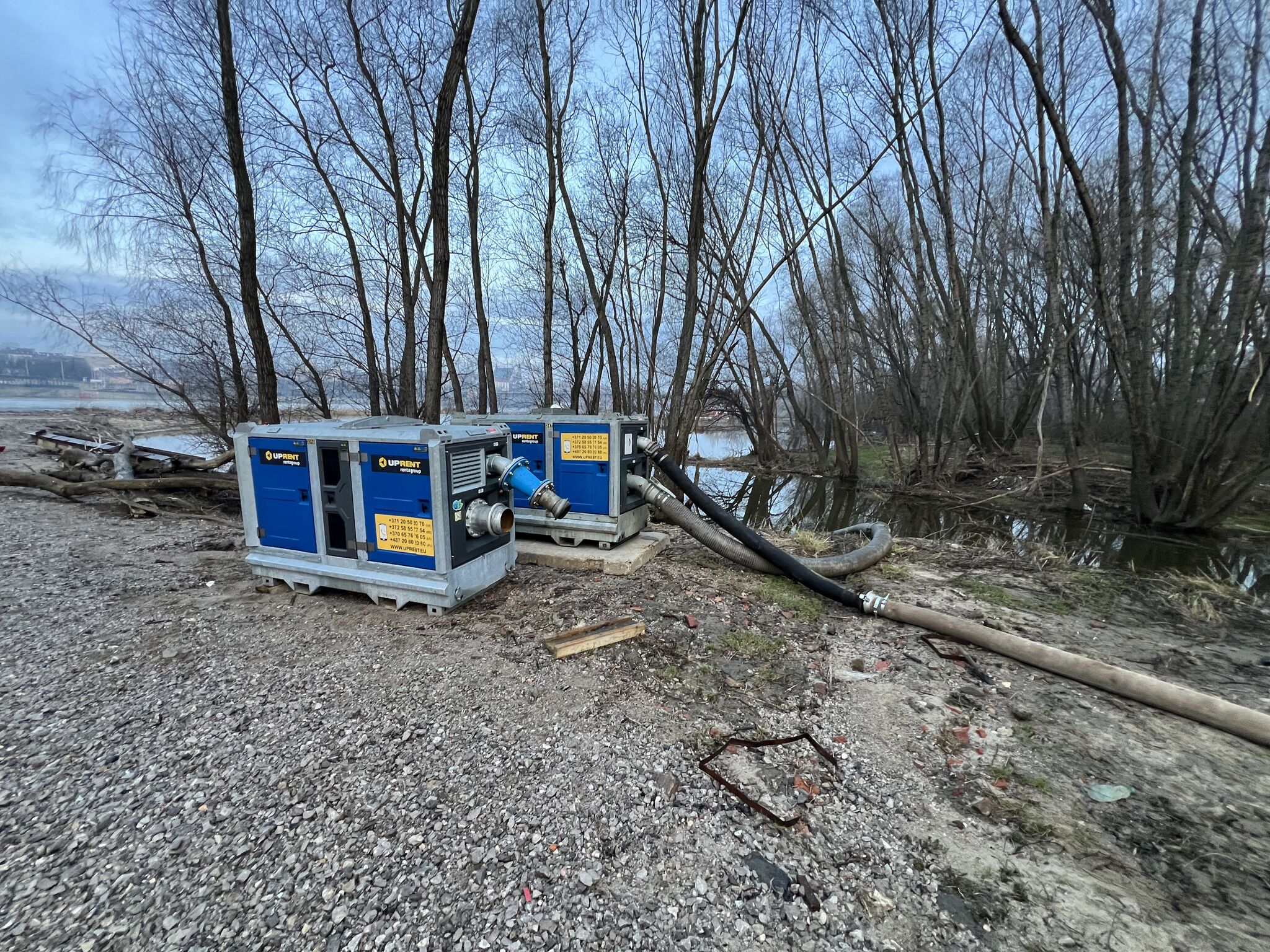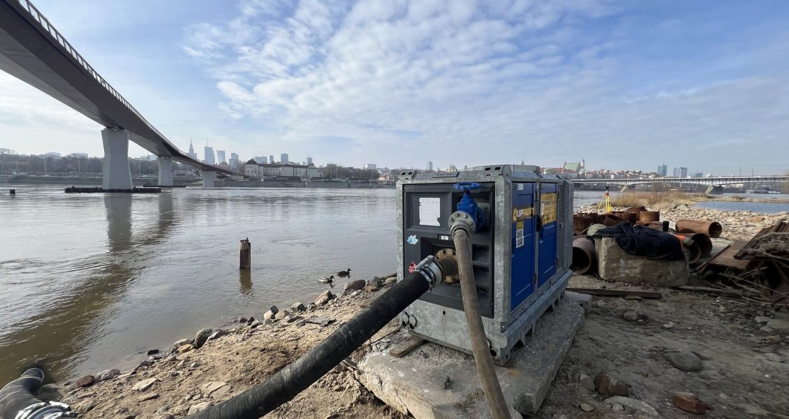 Do napełniania zbiorników wykorzystaliśmy pompę wolnostojącą wysokiego ciśnienia BBA BA80H oraz pompy zatapialne PRORIL TANK 475. Ze względu na długość testowanego odcinka kładki pieszo-rowerowej przy prawym brzegu Wisły zainstalowano zbiornik o pojemności 11 m³, co umożliwiło bezpośredni transfer wody do zbiorników usytuowanych wyżej. Do zatłaczania wody do zbiornika zastosowaliśmy pompę wirnikową BBA BA150E, uzupełnioną o rezerwową pompę BBA BA180KS. Jednocześnie, zgodnie ze schematem opracowanym przez Politechnikę Gdańską, spuszczaliśmy wodę ze zbiorników przy użyciu pomp Koshin KTX-80X. Kontrola przepływu oraz ilości zatłoczonej wody była realizowana przy pomocy przepływomierzy firmy Siemens. Całe testy statyczne przeprowadzono nieprzerwanie – od wczesnych godzin porannych aż do późnej nocy, co umożliwiło uzyskanie prawidłowych wyników.